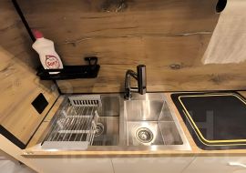 2.Двухсторонняя кухня, оснащённая всей необходимой техникой (двухдверный холодильник, 3х конфорочная варочная панель, вытяжка, духовой шкаф, микроволновка, чайник, тостер, встроенная стиральная машинка) и большой мойкой на две чаши.