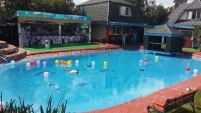 Во 2-м Коттедже спальня полностью меблирована, РУССКАЯ БАНЯ на дровах, теплый крытый БАССЕЙН 8х5 м, зал 20 м²., бильярд, TV, DVD, караоке профессиональное оборудование. На участке, расположены: ОТКРЫТЫЙ БАССЕЙН 15х10 м, зимой КАТОК и ПРОРУБЬ, большая крытая веранда с ШАТРОМ 9х10м, беседка - крытая на пруду, теннисный стол, мангал, зона барбекю, зона отдыха, стоянка на 8 машин. Коттедж предназначен на 25-30 спальных мест.