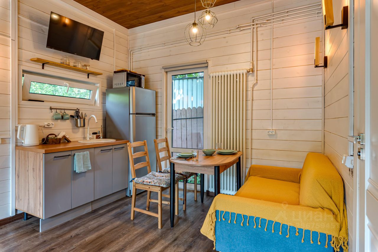 • Вторая часть первого этажа представляет собой комнату отдыха с диваном , столом, стульями и кухней. На кухне есть большой холодильник, микроволновая печь, индукционная плита, вся необходимая посуда капельная кофеварка питьевая вода, телевизор.