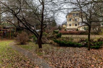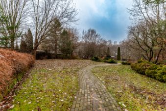 Большой участок с ландшафтным дизайном сразу за которым течет река. Можно плавать вода прозрачная, берег с причалом