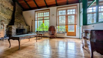 На 1-м этаже: прихожая, гардеробная, холл с панорамными прозрачными стенами. Столовая, кухня с необходимой посудой и техникой. Просторная гостиная с камином, высокими потолками, вторым светом и панорамным остеклением. Зимний сад с диванчиком. Ванная и с/у.