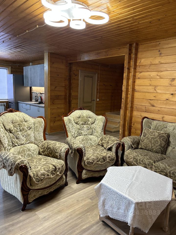- 1 этаж: Гостиная-кухня (2 дивана, ТВ), спальня с 2 кроватями, санузел, диван у выхода к мангалу. Этаж позволяет разместить за столами до 20 гостей, идеально для праздников и застолий