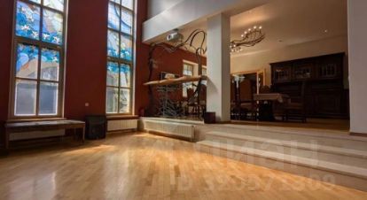 Фьюжн-интерьер: витражные окна, мрамор, камин, картины, высокие потолки