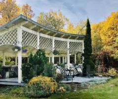 На участке газон, детская игровая зона, открытая беседка со встроенной кухней и мангалом. В ландшафтном дизайне сада много редких деревьев и растений, летом все утопает в цветах.