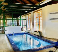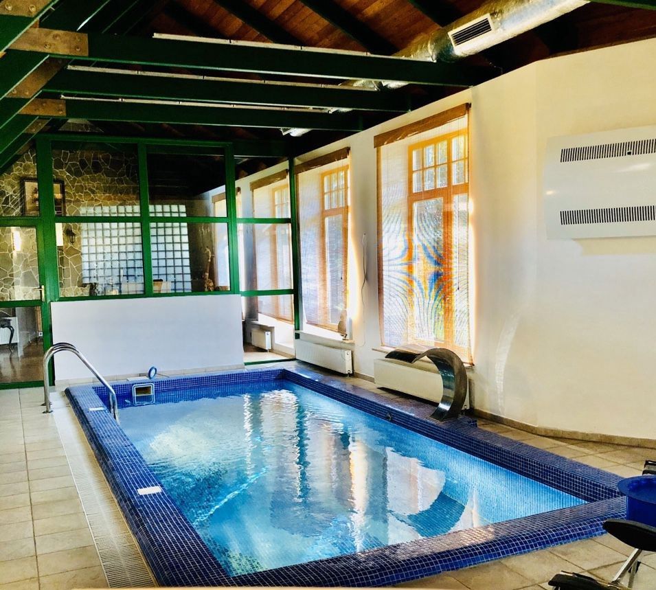 На первом этаже - финская сауна, бассейн 8*4 метра и глубина 1,6 м. с гидромассажем и подогревом, беговая дорожка и чудесная чайная комната с дровяным камином и настольный теннис.