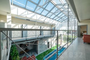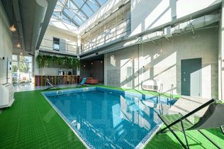 Внутри гостей ждет просторная гостиная с высокими потолками, наполненная светом и живописными видами на природу. Атриум из стекла над бассейном создает неповторимую атмосферу уюта. Закрытый тёплый бассейн с эффектной подсветкой подойдет для расслабления и для шумных водных забав любой компании. К зоне для отдыха примыкает большая кухня с новейшей техникой, посудой и аксессуарами, чтобы любые кулинарные идеи воплощались легко и с удовольствием. Электрическая сауна подарит расслабление и поможет восстановить силы в любое время года.