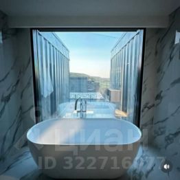 Ванная комната с панорамными окнами( гигиенические средства(шампунь, гель для душа, зубная щетка, зубная паста, фен)