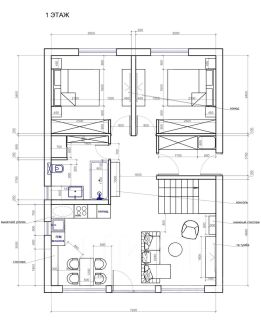 1 этаж: 2 спальни, гостиная-кухня с выходом на просторную террасу, санузел.