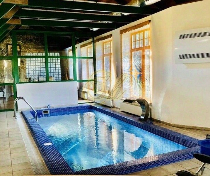 На первом этаже - финская сауна, бассейн 8*4 метра и глубина 1,6 м. с гидромассажем и подогревом, беговая дорожка и чудесная чайная комната с дровяным камином и настольный теннис.