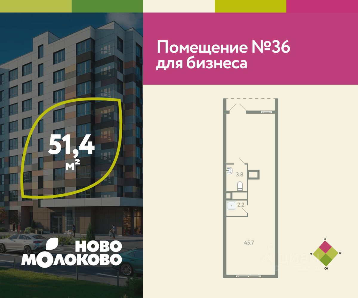 В продаже помещение свободного назначения 36 в готовом ЖК Ново Молоково (более 15 000 жителей). Прямая продажа от застройщика, помещение с ключами. Подходит для открытия street retail: супермаркета, аптеки, кофейни, коворкинга и тд. Общая площадь 51.4 м2, основные параметры:
