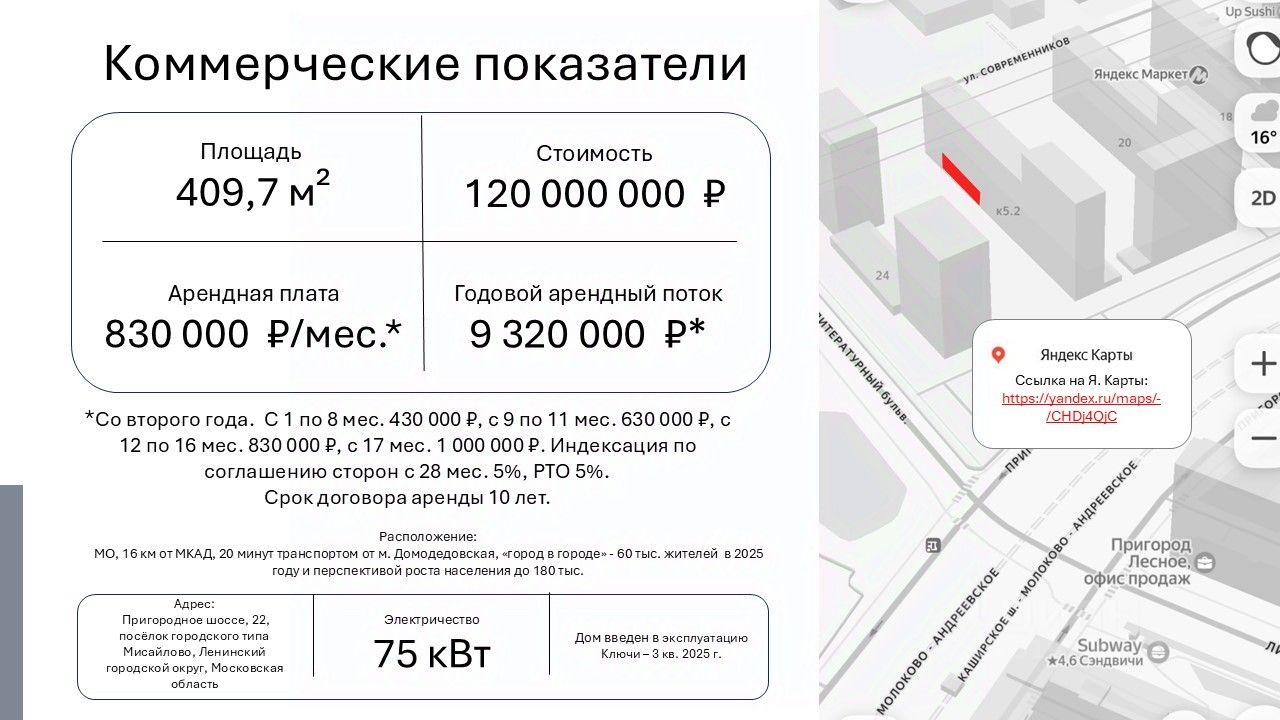 договор аренды заключен на 10 лет, условия: МАП: 1-8 месяц- 430 000РУБЛЕЙ;