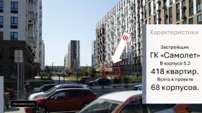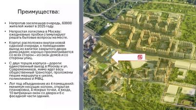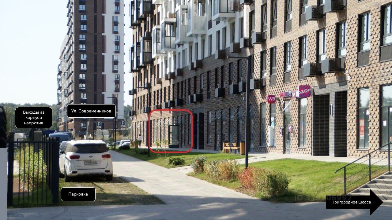 Корпус расположен внутри новой сданной очереди, напротив через шоссе - заселенный квартал, помещение видно с любого ракурса. Здание переменной этажности 12-17 этажей на 418 квартир находится между ул. Современников, вдоль которой проходят все маршруты к социальным объектам - школе, поликлинике, МФЦ, и курсирует автобус до метро Домодедовская, и трассой Каширское шоссе- Молоково - Андреевское, с нее есть удобный заезд через дублер для жителей дома и посетителей магазинов.