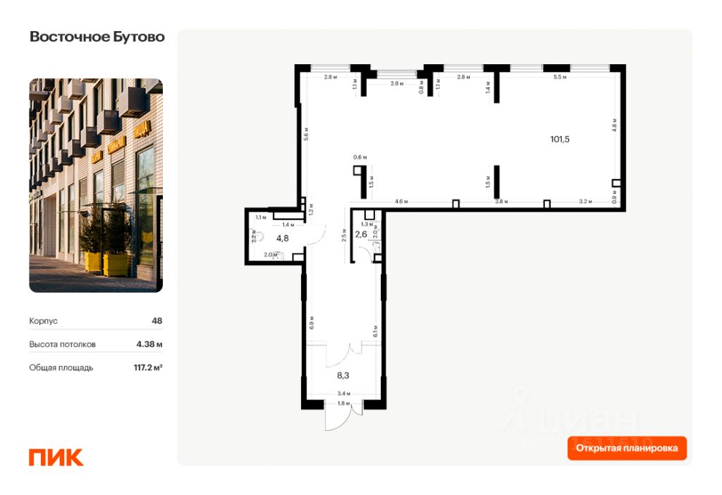 Выгода 5% на строящееся помещение по промокоду KEY5 до 30 ноября. Продаётся нежилое помещение свободного назначения в новом жилом районе Восточное Бутово от ПИК. Открытая планировка, витринное остекление, удобный вход на уровне земли. Помещение номер 9. Продажа напрямую от застройщика.