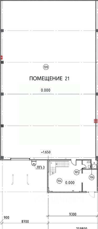 Планировка включает просторное помещение для производства, склада или логистики (537 кв.м), а также комфортную офисную часть (106,05 кв.м).