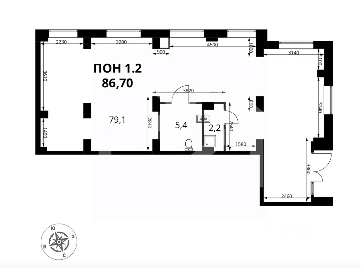 991409 . Предлагаем помещение свободного назначения формата street-retail в ЖК "1-й Южный", площадью 86.7 кв. м, расположенное на первом этаже 25-этажного жилого дома. Корпус 10. Без комиссии для покупателя.