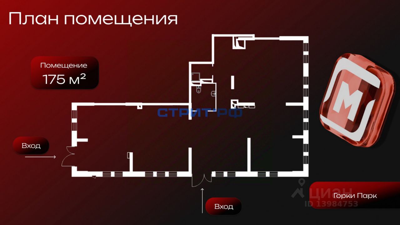 Арт. 93661189 Торговая площадь 175 м² с сетевым арендатором супермаркет "Магнит" в ЖК "Горки Парк". Угловое помещение на въезде в ЖК. Напротив большой паркинг. ЖК рассчитан на 27 000 жителей. Электрическая мощность 35 кВт.