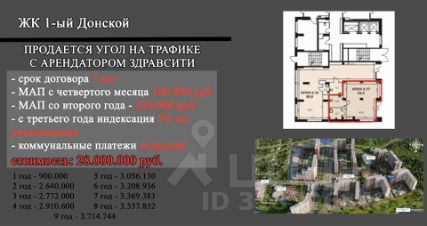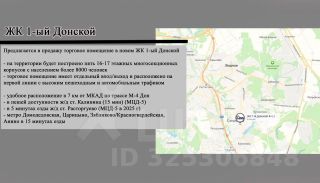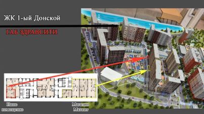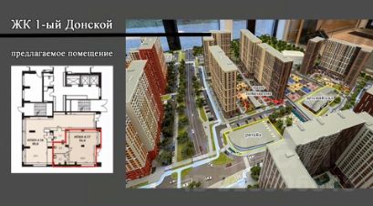 Помещение находится в новом огромном ЖК 1-Донской. В 7 км от МКАДа. Пять 16-17 этажных корпусов .