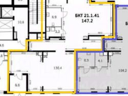 1 этаж 14-ти этажного жилого дома. Помещение площадью 147,2 кв.м. Отдельный вход с улицы. Высота потолков 5 м. Выделенная мощность электроэнергии 26 кВт ( возможно увеличения). Все центральные коммуникации. Без отделки, бетон.