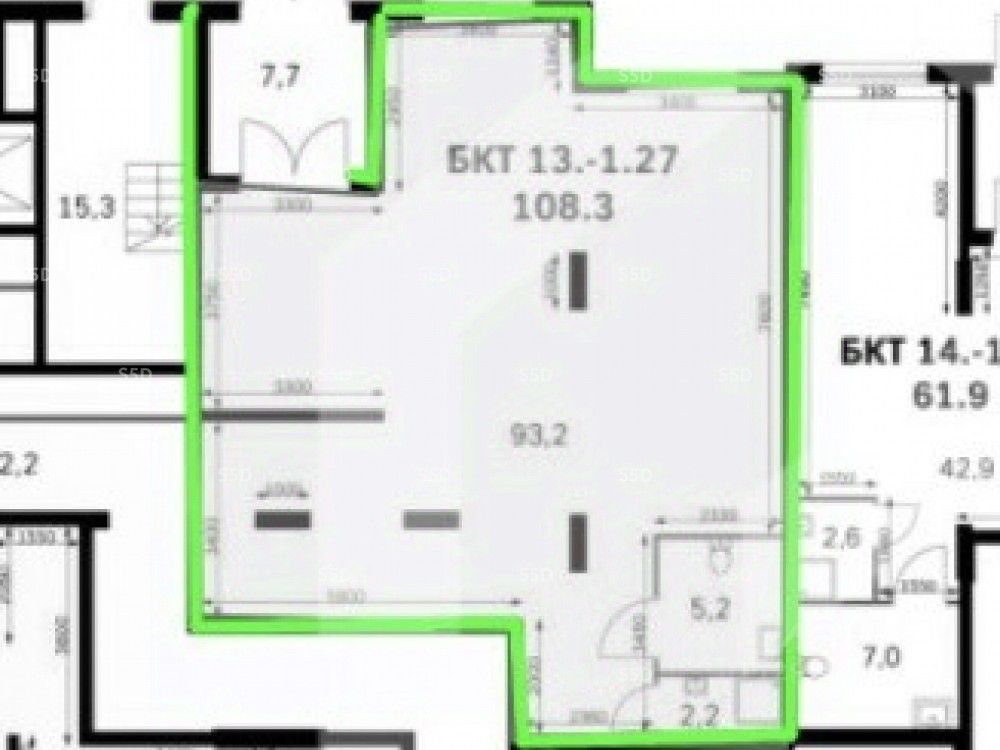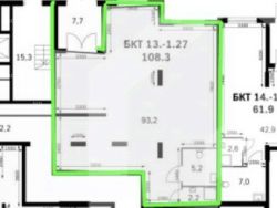 1 этаж 14-ти этажного жилого дома. Помещение площадью 108.3 кв.м. Отдельный вход с улицы. Высота потолков 4.67 м. Выделенная мощность электроэнергии 22 кВт ( возможно увеличения). Все центральные коммуникации. Без отделки, бетон.