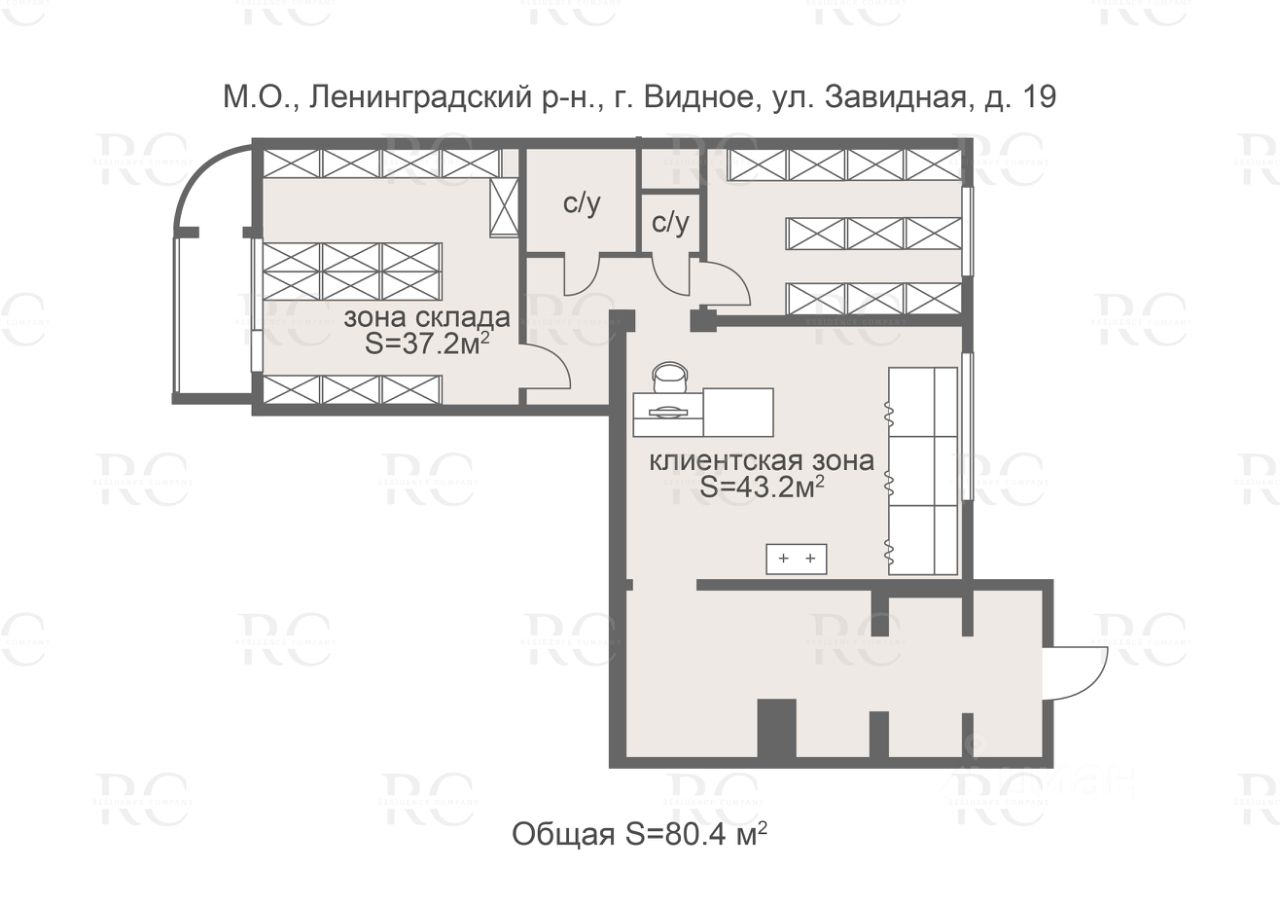 Планировкой предусмотрены: клиентская зона, два складских помещения, два санузла и входная группа. Также есть возможность сделать дополнительный отдельный вход.