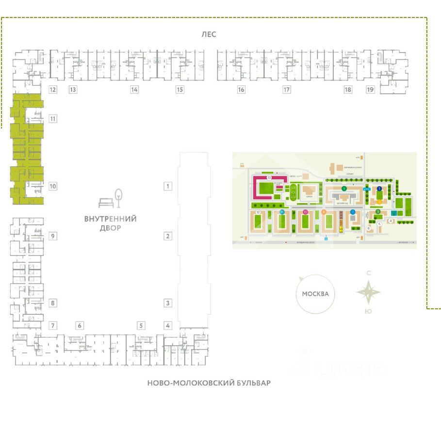 -ЖК состоит из 12 корпусов переменной этажности (от 9 до 12 этажей), рассчитанных на 4 383 квартиры;