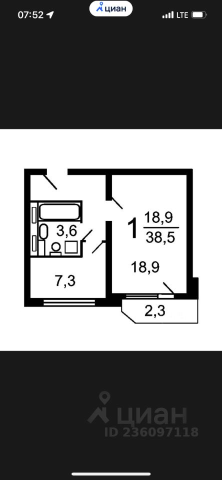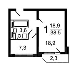 Общая жилая площадь 38,6 кв. м., кухня 7,3 кв. м., ванная комната 3,6 кв. м., потолки 2,7 метра.