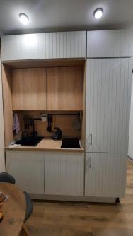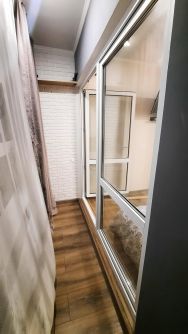 квартире есть всё необходимое для комфортной жизни, вся мебель остаётся. Окно выходит на улицу, вид из окна красивый, так как напротив дома нет. Очень удобное разделение спальной и кухонной зоны, гости могут остаться с ночёвкой и при этом будет комфортно всем, огромный шкаф, кровать с подъёмным механизмом, в ванной также имеется большое количество зон для хранения, В том числе полотенец. На лоджии есть небольшой стол для работы, над столом шкаф для хранения.