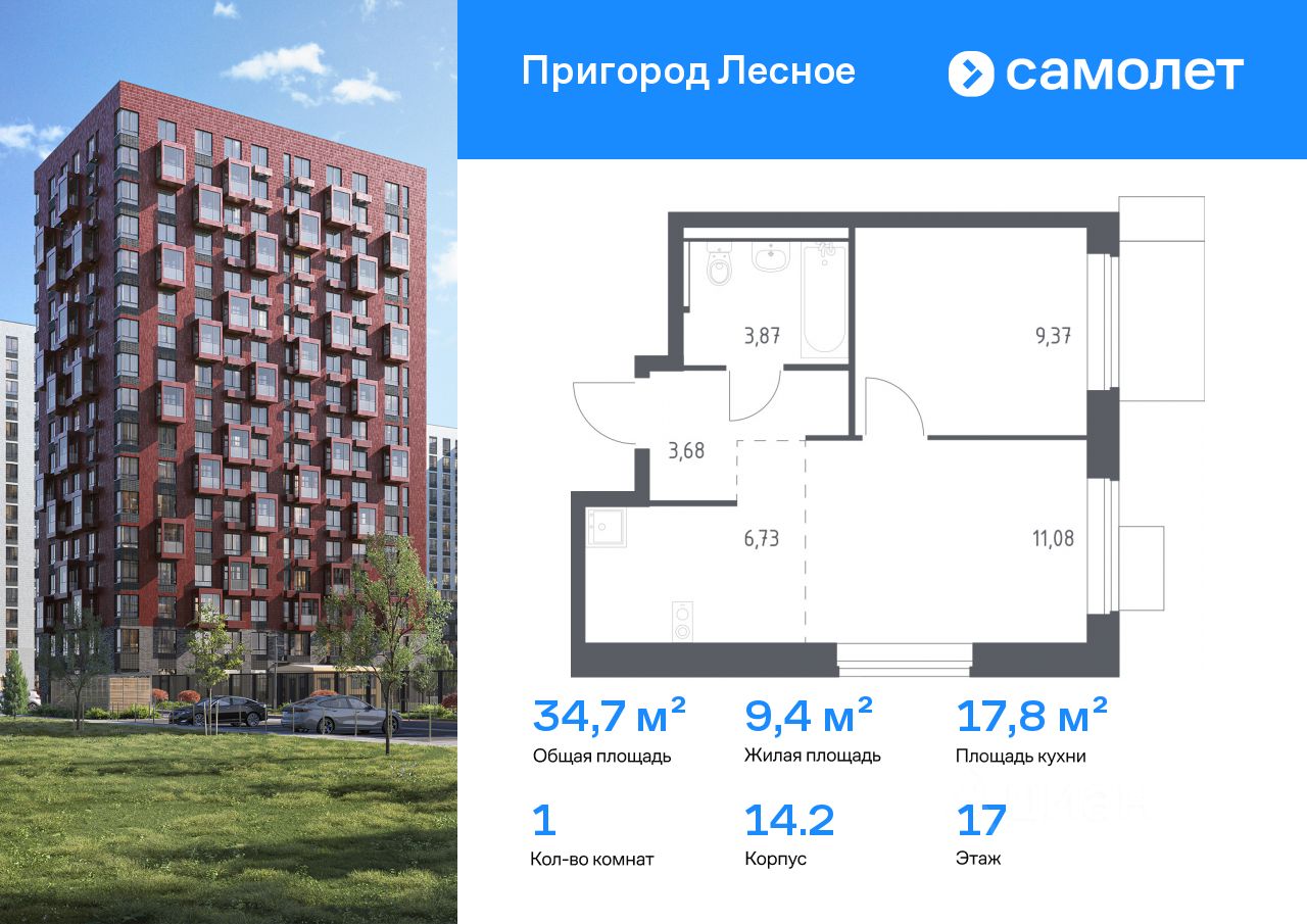 Предлагается 1-комнатная квартира комфорт-класса 34,73 кв.м в корпусе 14.2 на 17 этаже, в ЖК "Пригород Лесное"