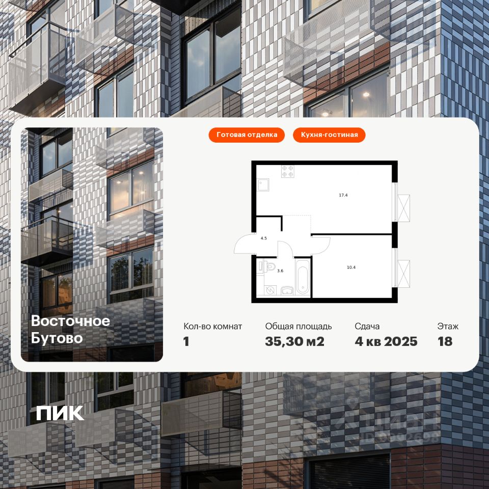 Продаётся 1-комн. квартира площадью 35,3 кв.м на 18 этаже 25 этажного дома (Корпус 42, Секция 4) проекта ПИК Восточное Бутово. Светлый просторный подъезд на уровне земли, функциональная планировка, большие окна, c отделкой.