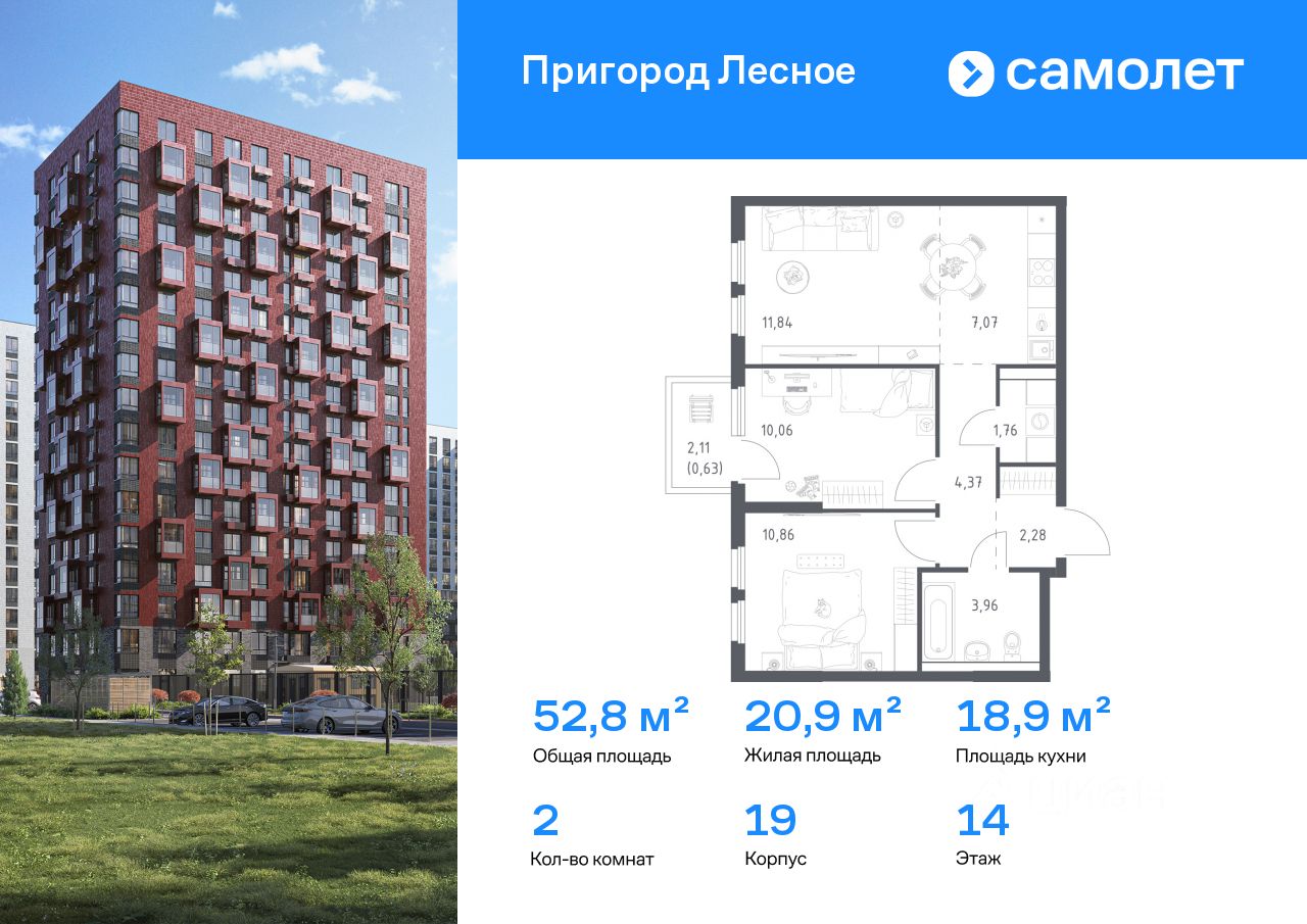 Предлагается 2-комнатная квартира комфорт-класса 52,83 кв.м в корпусе 19 на 14 этаже, в ЖК "Пригород Лесное"