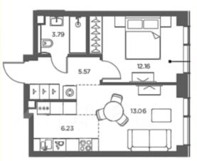 * Площадь и два окна позволяет легко организовать просторную спальню и большую кухню-гостиную.