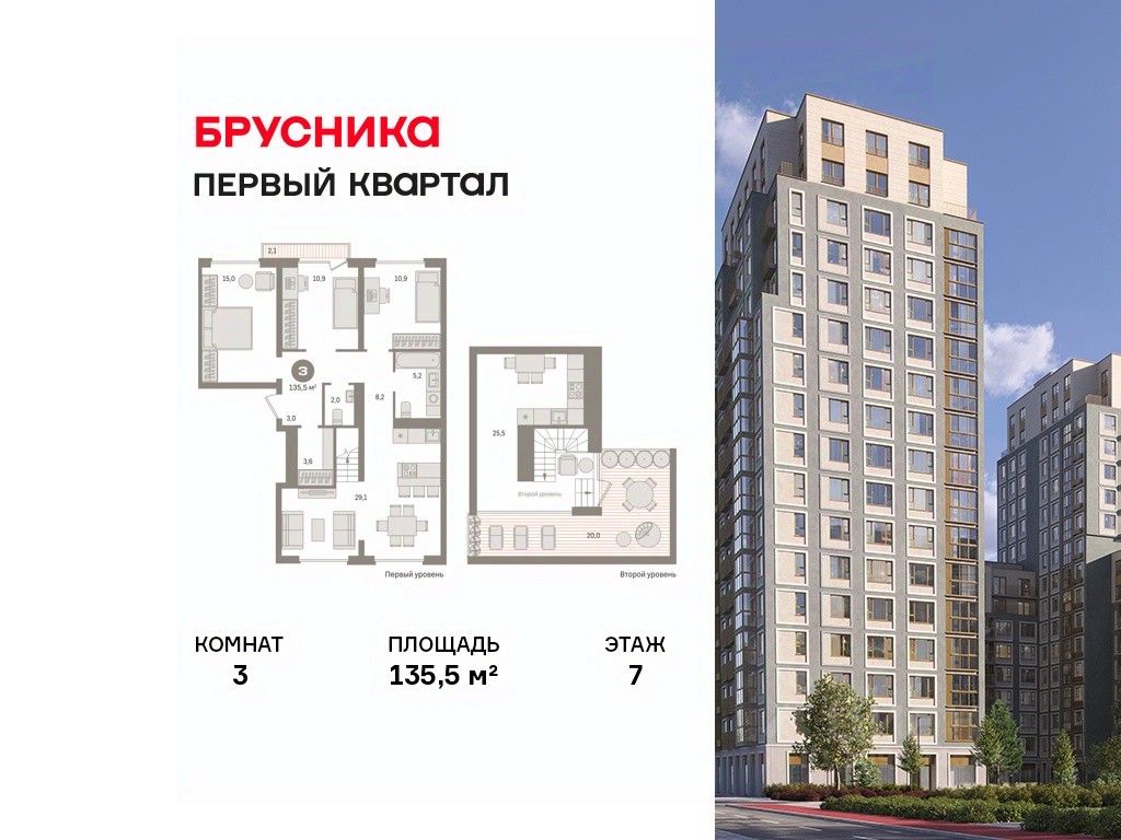 Квартира с кухней-гостиной и тремя спальнями в "Первом квартале". Особенности планировки: окна на две стороны, второй санузел, окно в коридоре, гардеробная, без отделки, двухуровневая, разнесённые спальни, терраса, балкон, терраса на крыше.