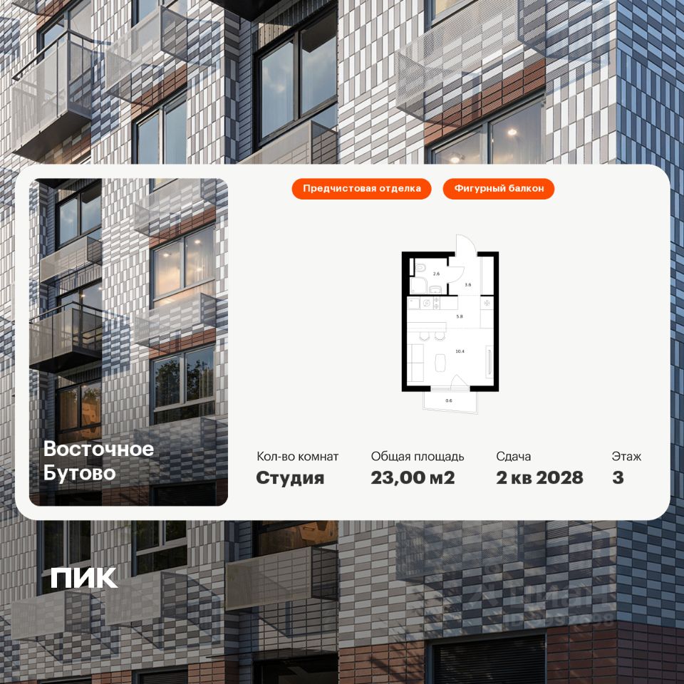 Продаётся квартира-студия площадью 23 кв.м на 3 этаже 25 этажного дома (Корпус 47, Секция 3) проекта ПИК Восточное Бутово. Светлый просторный подъезд на уровне земли, функциональная планировка, большие окна, предчистовая отделка.