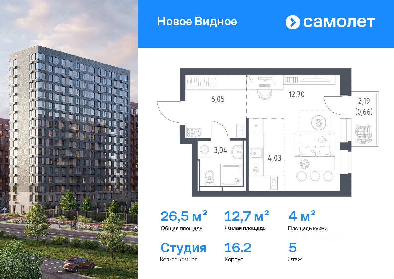 Предлагается квартира студия комфорт-класса 26,48 кв.м в корпусе 16.2 на 5 этаже, в ЖК "Новое Видное"