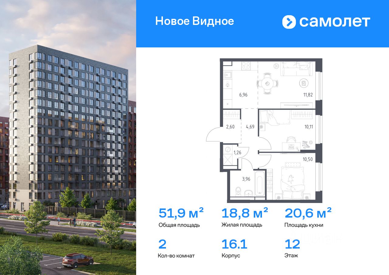 Предлагается 2-комнатная квартира комфорт-класса 51,9 кв.м в корпусе 16.1 на 12 этаже, в ЖК "Новое Видное"