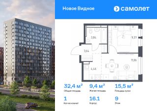 Предлагается 1-комнатная квартира комфорт-класса 32,37 кв.м в корпусе 16.1 на 9 этаже, в ЖК "Новое Видное"