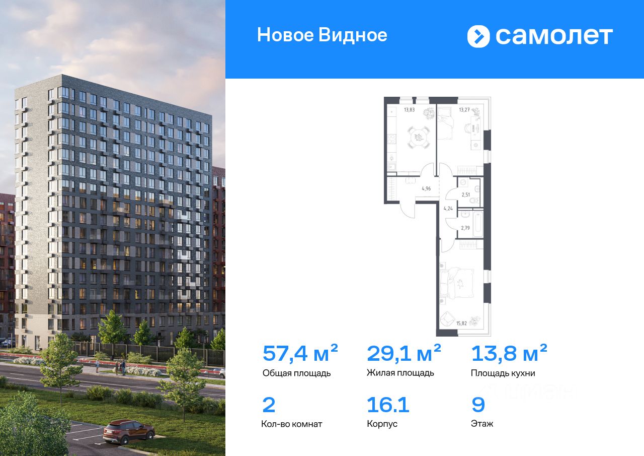 Предлагается 2-комнатная квартира комфорт-класса 57,42 кв.м в корпусе 16.1 на 9 этаже, в ЖК "Новое Видное"