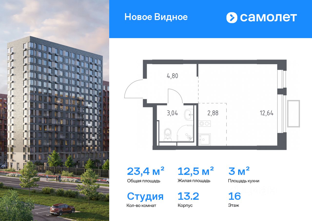 Предлагается квартира студия комфорт-класса 23,36 кв.м в корпусе 13.2 на 16 этаже, в ЖК "Новое Видное"