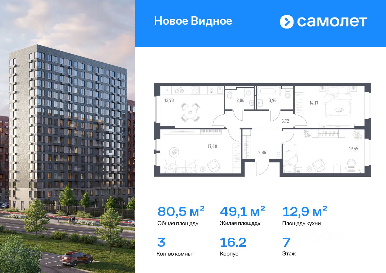 Предлагается 3-комнатная квартира комфорт-класса 80,45 кв.м в корпусе 16.2 на 7 этаже, в ЖК "Новое Видное"