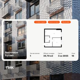 Продаётся 1-комн. квартира площадью 38,2 кв.м на 16 этаже 16 этажного дома (Корпус 41, Секция 1) проекта ПИК Восточное Бутово. Светлый просторный подъезд на уровне земли, функциональная планировка, большие окна, c отделкой.