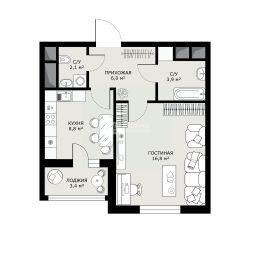 •просторная квартира с общей площадью 39,3 кв. м, жилая 16,8 кв и высокими потолками 2,97 м