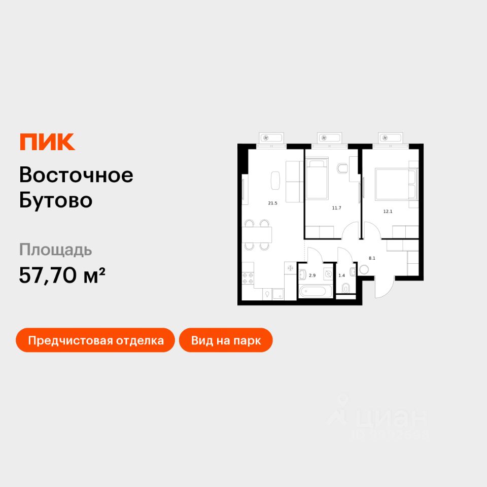 Продаётся 2-комн. квартира площадью 57,7 кв.м на 2 этаже 17 этажного дома (Корпус 48, Секция 2) проекта ПИК Восточное Бутово. Светлый просторный подъезд на уровне земли, функциональная планировка, большие окна, предчистовая отделка.