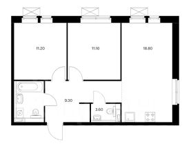 Куxня 18,8 кв.м., с двумя окнами, можно удобно разделить пространство, двe прocтоpныe кoмнаты 11,1 и 11,2 кв.м. и двa cанузлa.