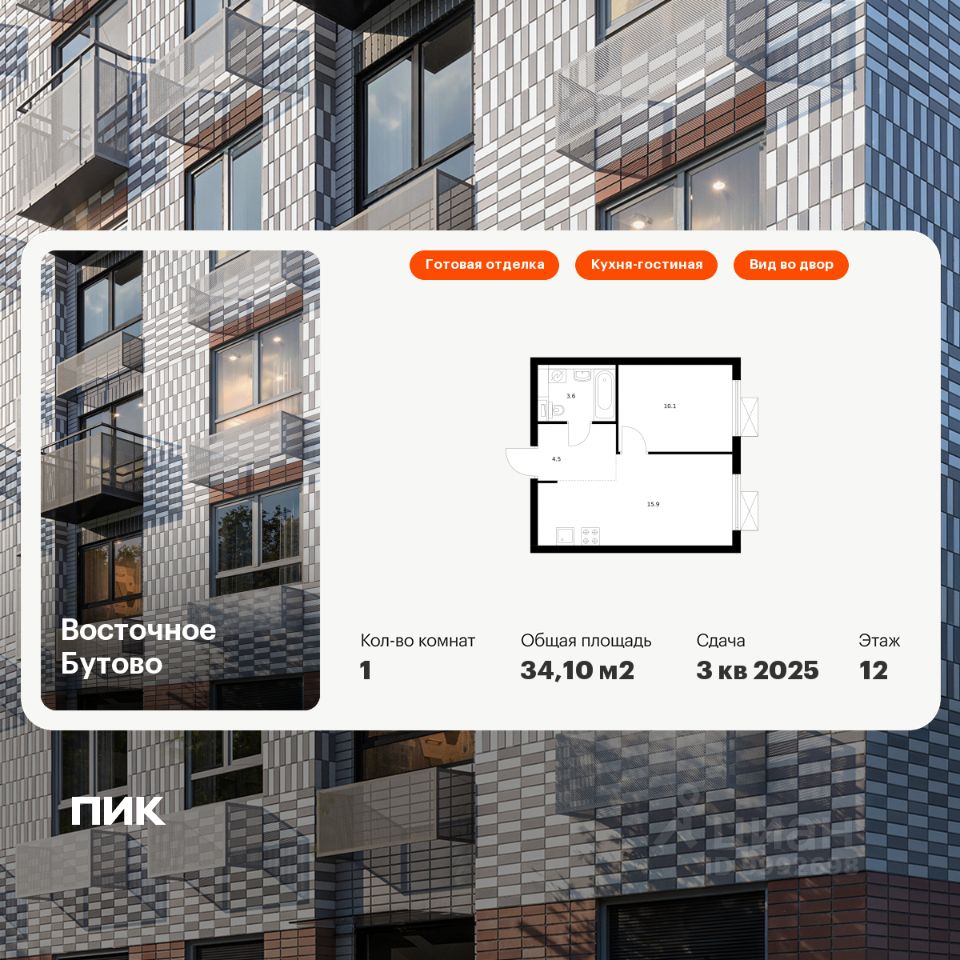 Продаётся 1-комн. квартира площадью 33,7 кв.м на 12 этаже 16 этажного дома (Корпус 41, Секция 1) проекта ПИК Восточное Бутово. Светлый просторный подъезд на уровне земли, функциональная планировка, большие окна, c отделкой.