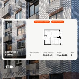 Продаётся 1-комн. квартира площадью 33,8 кв.м на 3 этаже 17 этажного дома (Корпус 48, Секция 2) проекта ПИК Восточное Бутово. Светлый просторный подъезд на уровне земли, функциональная планировка, большие окна, предчистовая отделка.