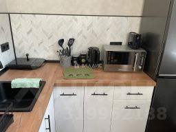 В квартире установлен кухонный гарнитур с бытовой техникой и соответствующей утварью.