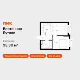 Продаётся 1-комн. квартира площадью 33,3 кв.м на 16 этаже 17 этажного дома (Корпус 48, Секция 2) проекта ПИК Восточное Бутово. Светлый просторный подъезд на уровне земли, функциональная планировка, большие окна, предчистовая отделка.
