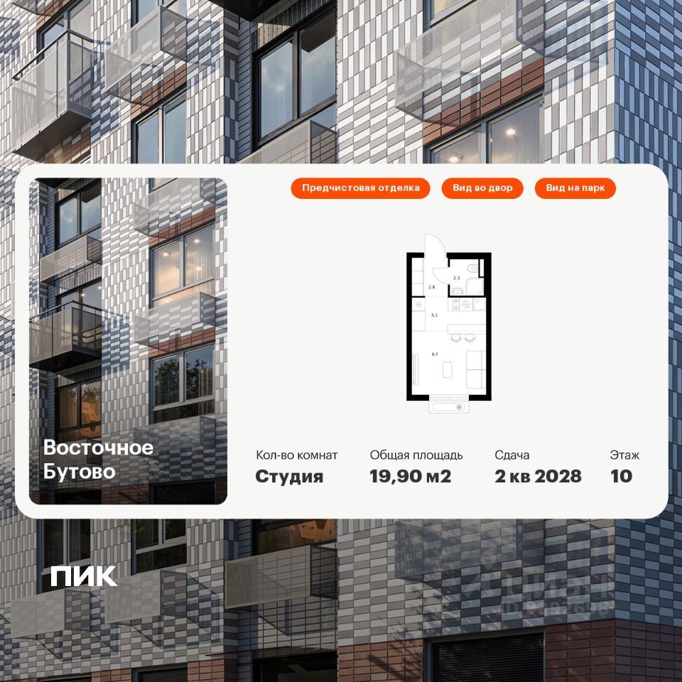 Продаётся квартира-студия площадью 19,9 кв.м на 10 этаже 17 этажного дома (Корпус 48, Секция 2) проекта ПИК Восточное Бутово. Светлый просторный подъезд на уровне земли, функциональная планировка, большие окна, предчистовая отделка.