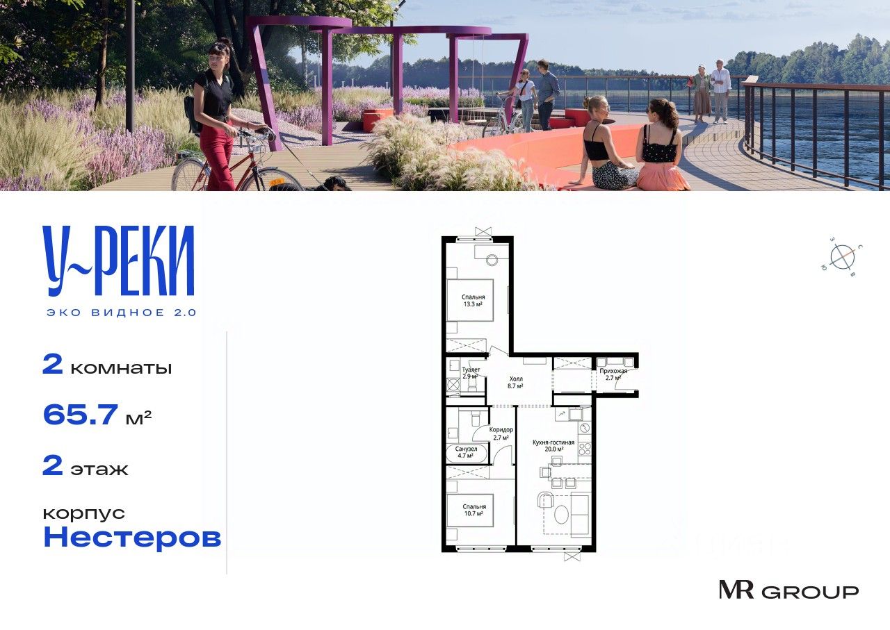 Продаётся 2-к квартира общей площадью 65.70 м² с предчистовой отделкой в ЖК "У реки. Эко Видное 2.0" на 2-м этаже корпуса Нестеров.