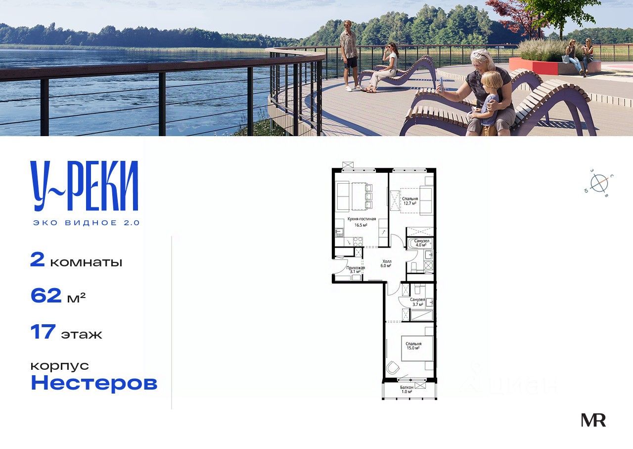 Продаётся 2-комнатная квартира общей площадью 62 м² с предчистовой отделкой в ЖК "У реки. Эко Видное 2.0" на 17-м этаже корпуса Нестеров.